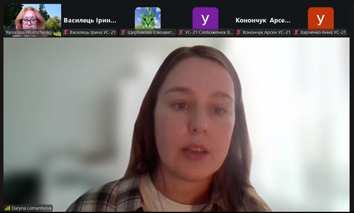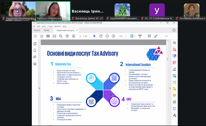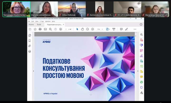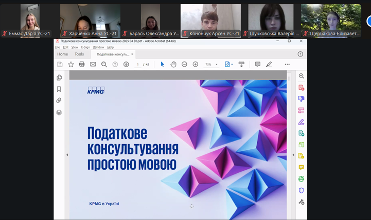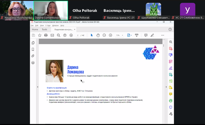28 жовтня 2025 р. відбулася онлайн-зустріч зі старшою менеджеркою напряму податкового консультування KPMG Ukraine Дариною Ломанцовою. Захід проведено в рамках навчального процесу з дисципліни «Оподаткування», яку викладає к.е.н., доцент кафедри міжнародної економіки Ярослава Іванівна Глущенко.