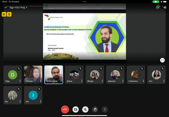 10 березня 2025 року відбулася зустріч студентів 5 курсу спеціальності  «Економіка» освітньої програми «Міжнародна економіка» з Мохаммадом Юнісом, менеджером із зовнішніх зв’язків Інституту інновацій Курдистану, випускником кафедри менеджменту КПІ ім. Ігоря Сікорського (2018 р.). У межах дисципліни «Міжнародні стратегії економічного розвитку» він провів лекцію на тему «Стратегії розвитку для сталого майбутнього», присвячену інноваційному розвитку Іракського Курдистану. Зустріч організувала проф., д.е.н. Оксана Онуфріївна Охріменко.