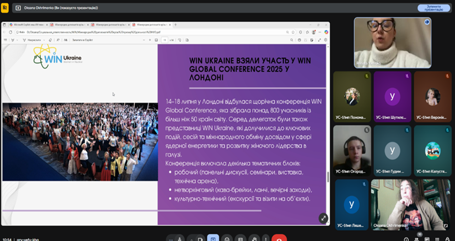 22 жовтня 2025 р.  відбулася гостьова лекція в межах вивчення дисципліни «Міжнародні економічні організації» для здобувачів ступеня «Магістр» за освітньо-професійною програмою «Міжнародна економіка» (група УС-51 мп), на тему: «Міжнародна дипломатія крізь призму діяльності неурядових організацій (НУО)». З лекцією виступила  Яресько Рената, кандидат економічних наук, засновниця та директорка консультаційно-комунікаційної агенції CommsTrue, директорка з розвитку та комунікацій WiN Ukraine — національного представництва глобальної організації Women in Nuclear (WiN) Global.